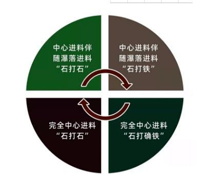 基本工作原理與中心進(jìn)料伴隨瀑落料“石打鐵”相同,而進(jìn)料方式為完全中心進(jìn)料。